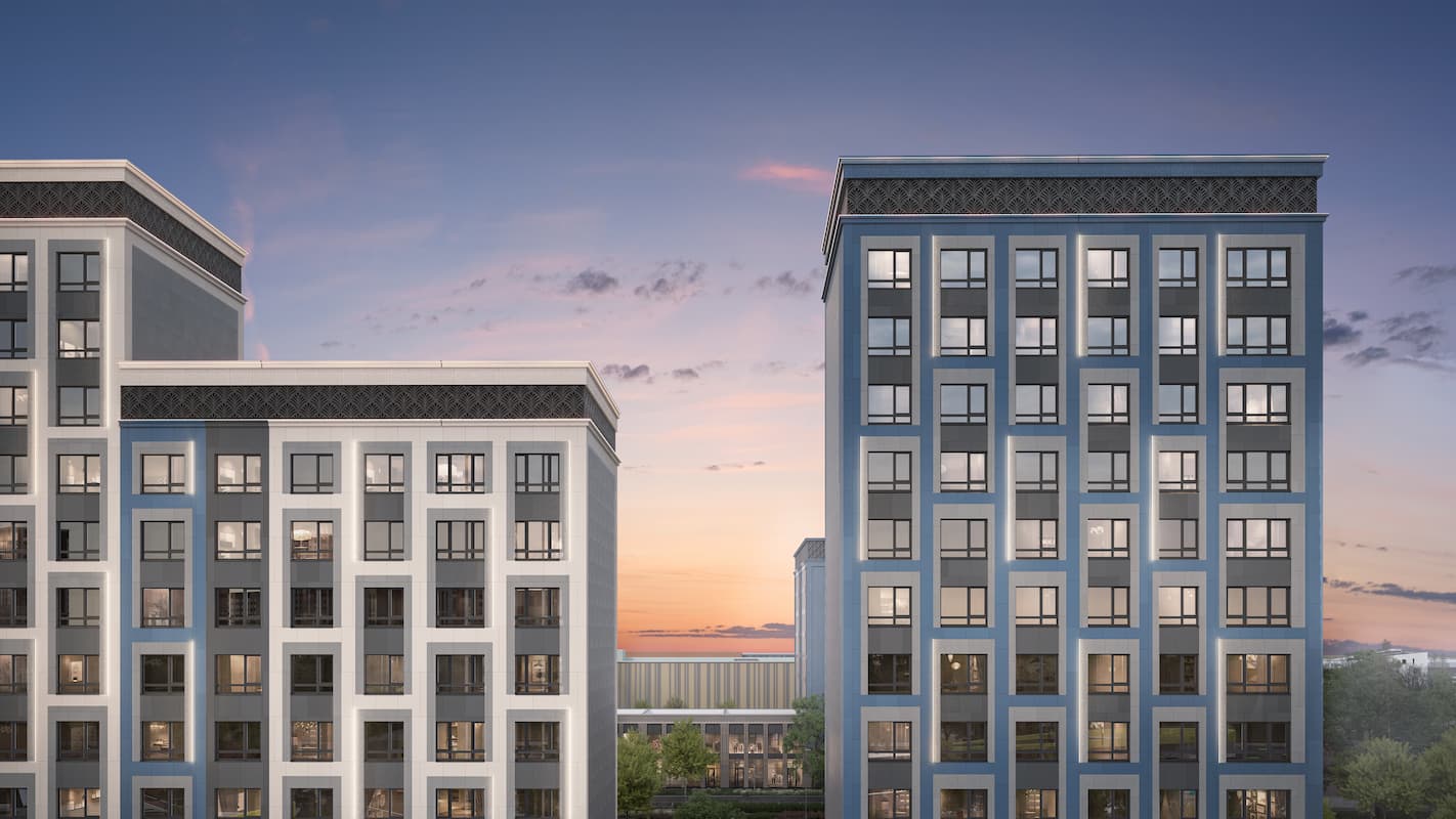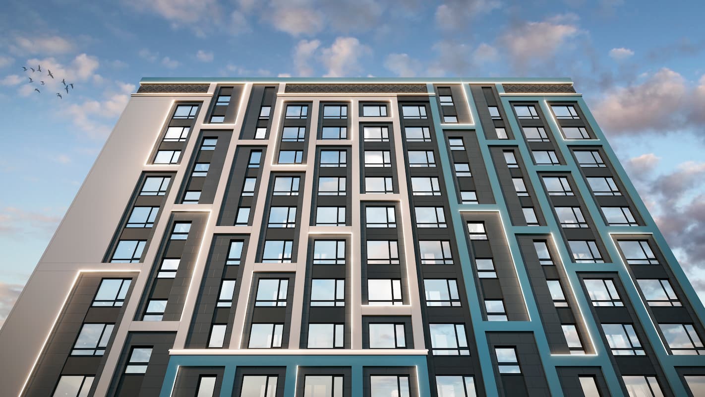 Фасады квартала на Шолохова «Сияние» - уникальное архитектурное решение жилых и коммерческих помещений. Здания небесно-голубого цвета будут заметны с проспекта Шолохова и оформлены композитом, керамогранитом и алюкобондом.
