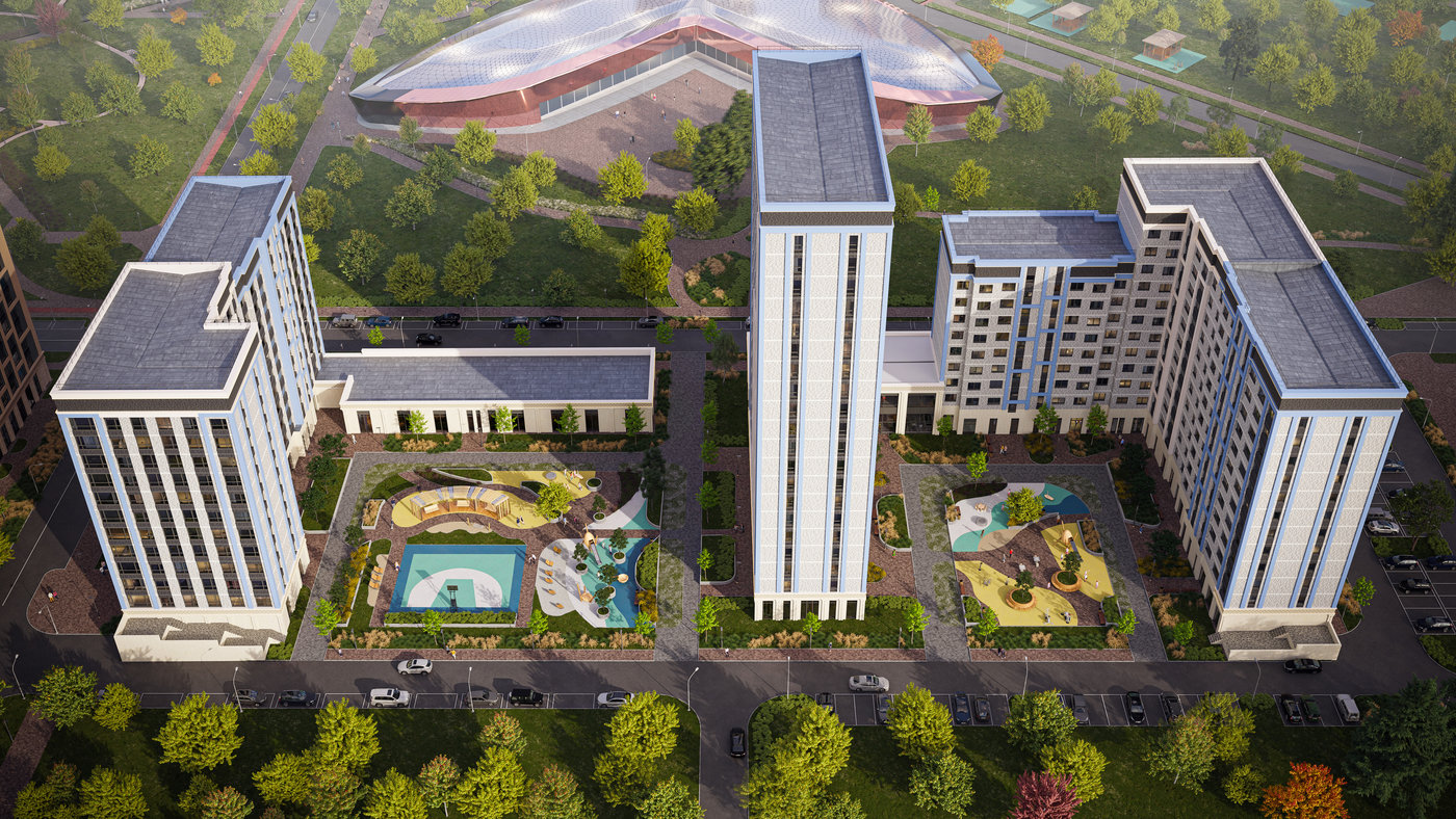 Детский сад на 200 мест будет построен прямо во дворе, школа на 900 учеников — в нескольких минутах, а напротив литера — спорткомплекс с 5 залами напротив. На территории также предусмотрен паркинг на 198 мест.