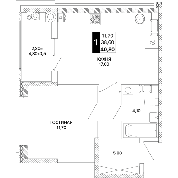 1-комнатная квартира 40,80 м²