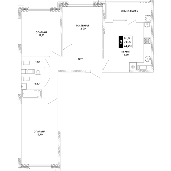 3-комнатная квартира 74,20 м²