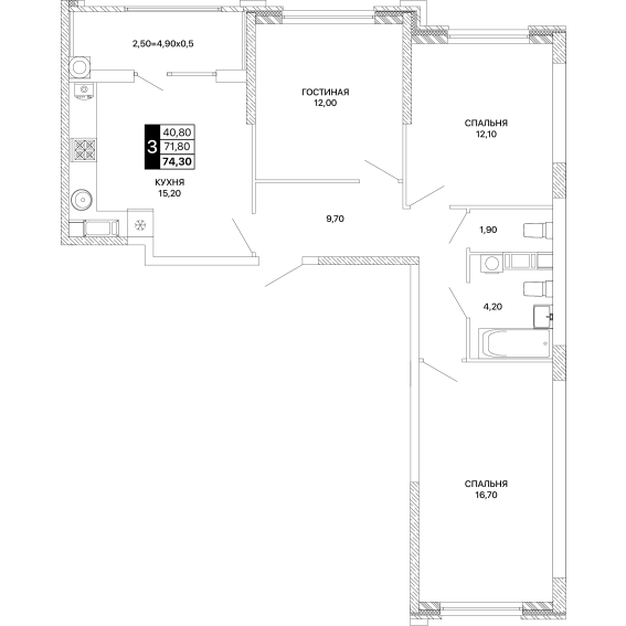 3-комнатная квартира 74,30 м²