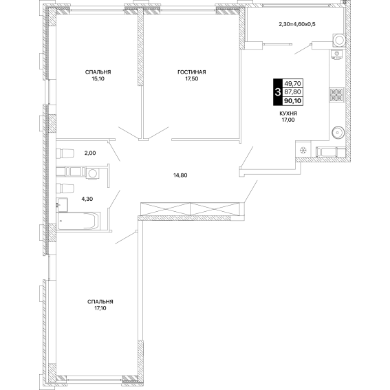 3-комнатная квартира 90,10 м²