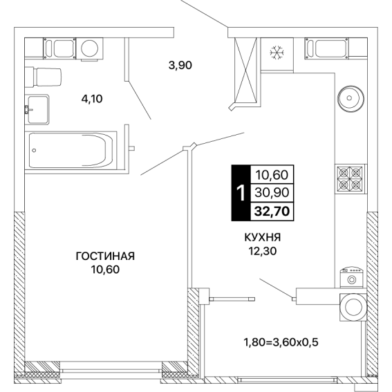 1-комнатная квартира 32,70 м²