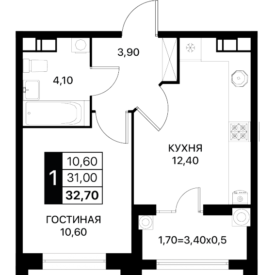 1-комнатная 32,70 кв.м